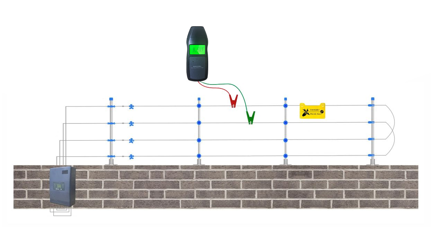 1.脈沖主機電壓測量:脈沖主機布防工作后,把脈沖電壓測量儀的夾具分布夾在脈沖圍欄上任意相鄰的兩根線上,如下圖所示: