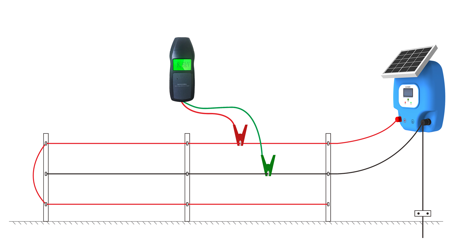 2.畜牧電圍欄電壓測量:畜牧電圍欄主機通電工作后,把脈沖電影測量儀的紅色夾具夾在電圍欄脈沖輸出線上,綠色夾具夾在電圍欄接地線上,如下圖所示: