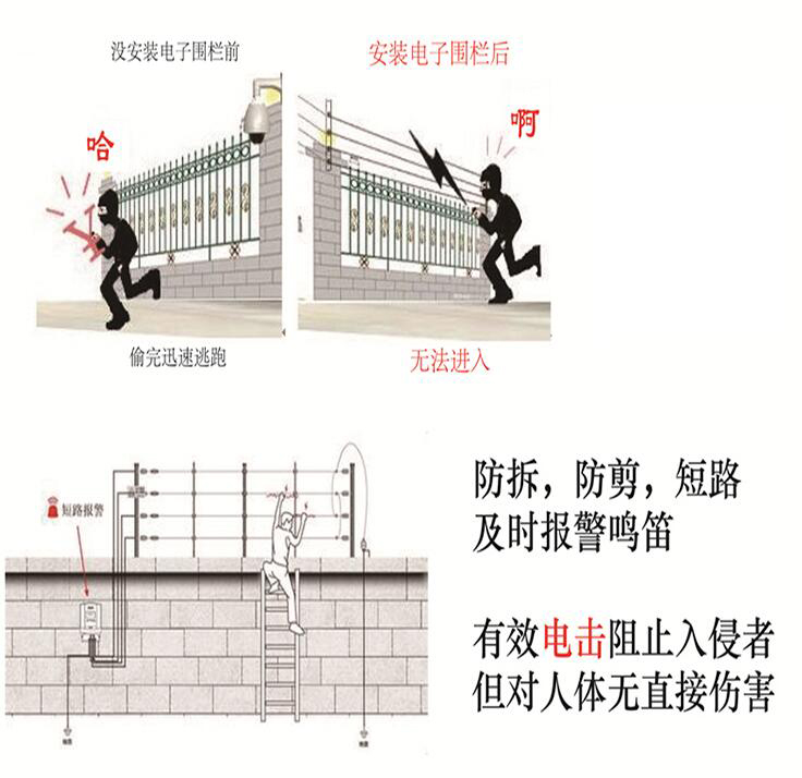 B。對執(zhí)意入侵者再給予脈沖電擊,促使其離開;數(shù)道電線組成的圍欄有效阻止人為翻越。